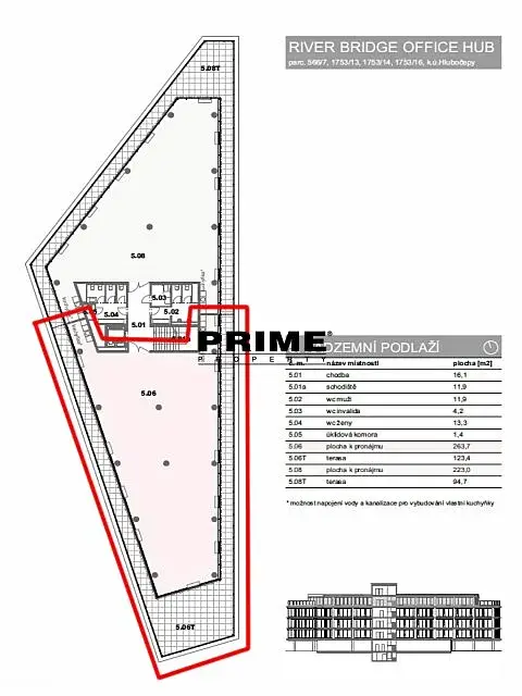 Nové kancelářské prostory k pronájmu, 264m2 + obvodová terasa o výměře 123m2, situované ve 4. patře (posledním patře) v nové moderní administrativní budově River Bridge Office Hub. Objekt je součástí areálu River Business Centre a nachází se na rozhraní Smíchova a Hlubočep, na břehu Vltavy, u Dvoreckého mostu, přímo u rychlostní silnice R4, naproti zastávce tramvaje a stanici autobusu, nedaleko stanice metra a vlakového nádraží Smíchovské nádraží, 5 minut na dálnici D5 a 6 minut na dálnici D1.