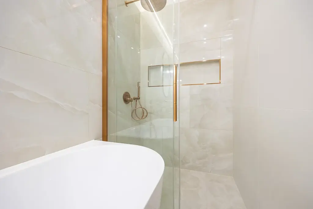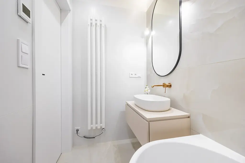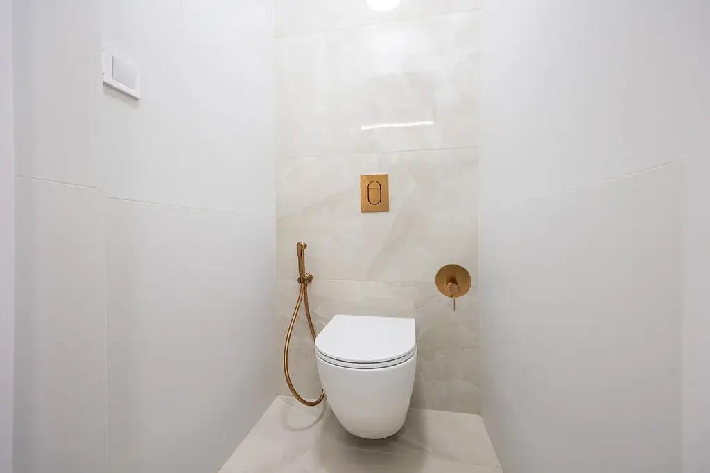 Koupelna je vybavena luxusní přisazenou vanou, sprchovým koutem s nikou a designovým umyvadlem na skříňce. O teplo se postará topný žebřík a podlahové vytápění. Všechny baterie jsou podomítkové značky Grohe. Samostatná toaleta je také vybavena bidetovou sprchou s podomítkovou baterií.