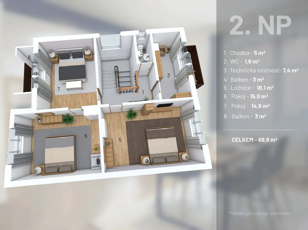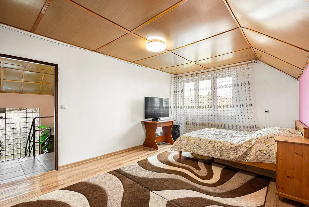 * 2. patro: tři samostatné pokoje, WC a místnost s potenciálem pro další koupelnu či kuchyň