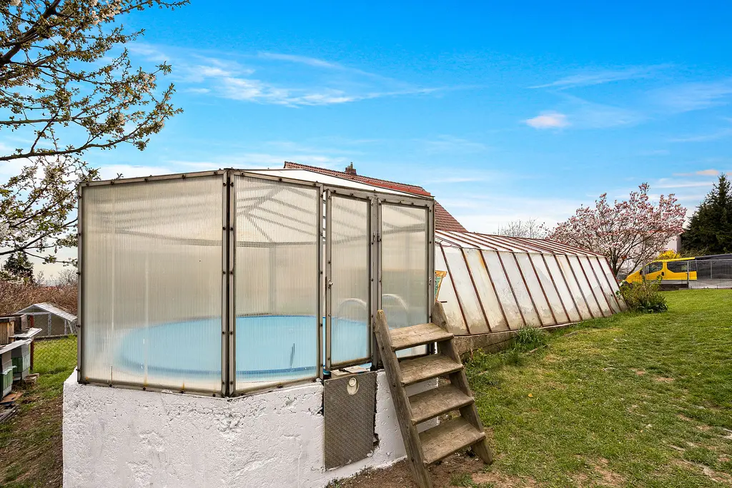 Na zahradě najdete skleník, zděný bazén po rekonstrukci, drobné stavby pro skladování a také vzrostlou magnólii.