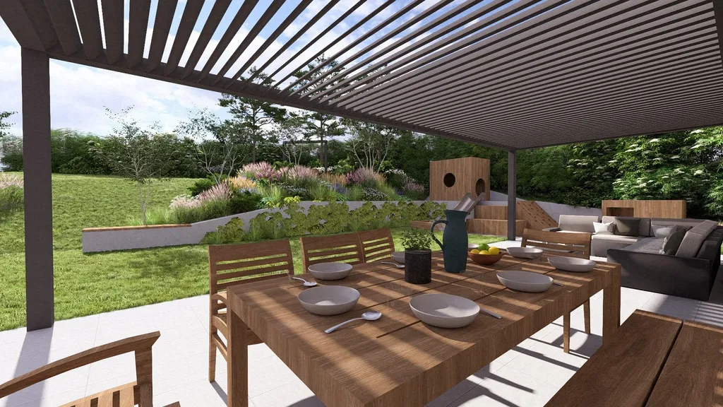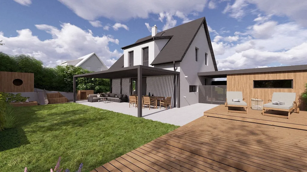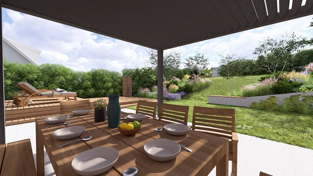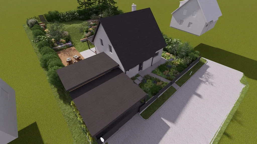 Celá studie prostorového a technického řešení zahrady, včetně doporučení ověřených kontaků na dokončení navrhovaných prvků a osázení rostlinami, je součástí prodejní ceny domu.