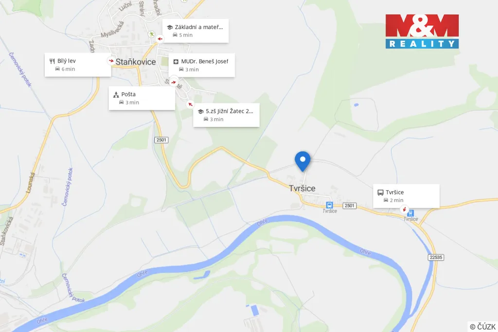 V blízkosti je napojení na hlavní tah Karlovy Vary - Praha, zámek Stekník a historické město Žatec.