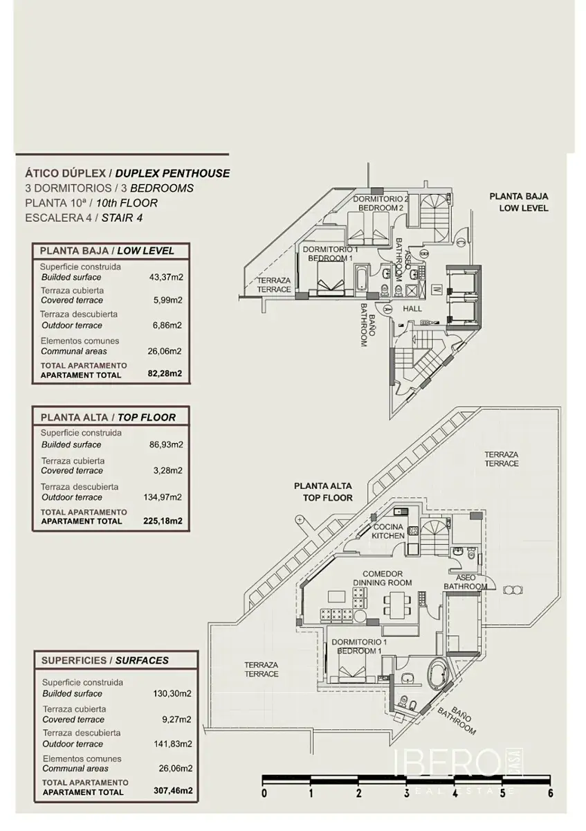 Přízemí těchto mezonetových nemovitostí se skládá ze vstupní haly, 2 ložnic a 2 koupelen (z nichž jedna má vlastní koupelnu). Obě ložnice mají přístup na krytou terasu. Schody nás zavedou do horního patra. Zde se nachází prostorný obývací pokoj s jídelnou, samostatná kuchyň, ložnice s šatnou a vlastní koupelnou, toaleta pro hosty a obrovská střešní terasa. Z této terasy je nádherný výhled na Středozemní moře, skálu Calpe a Saliny. Penthousy jsou vybaveny klimatizacív teplé/studené.