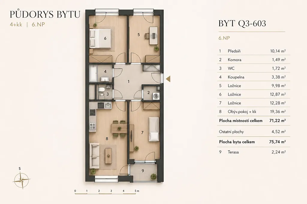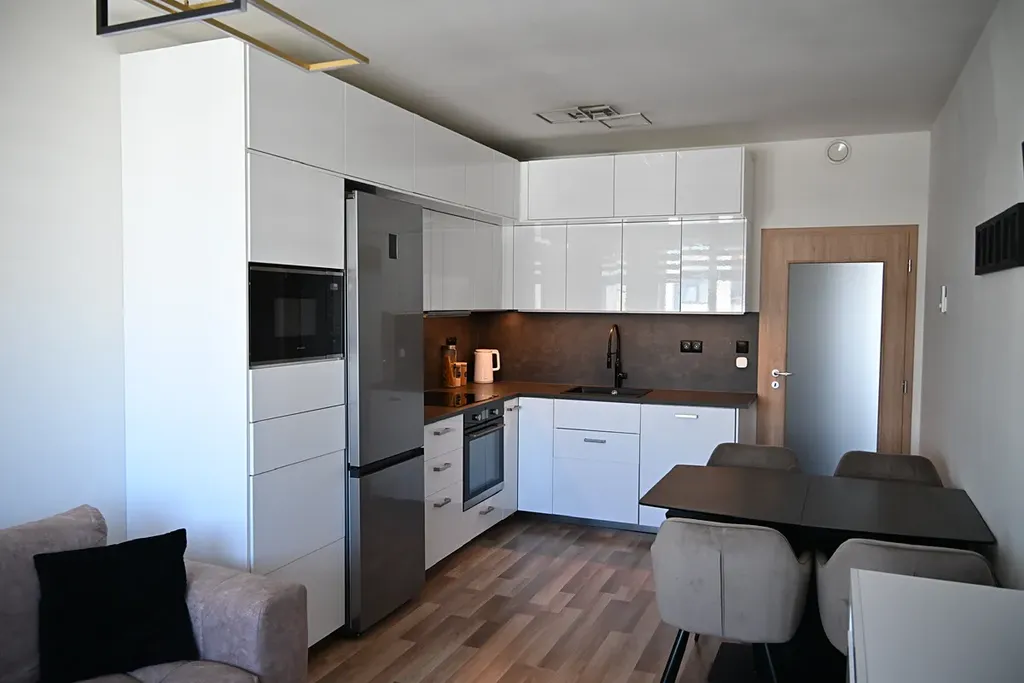 Nabízím k prodeji moderní byt o dispozici 4+kk s garážovým stáním, který se nachází v 6. nadzemním podlaží novostavby z roku 2022 v klidné části Prahy – Uhříněves. Jedná se zároveň o nejvyšší podlaží v domě, což zajišťuje větší soukromí, klid a příjemné výhledy do okolí.