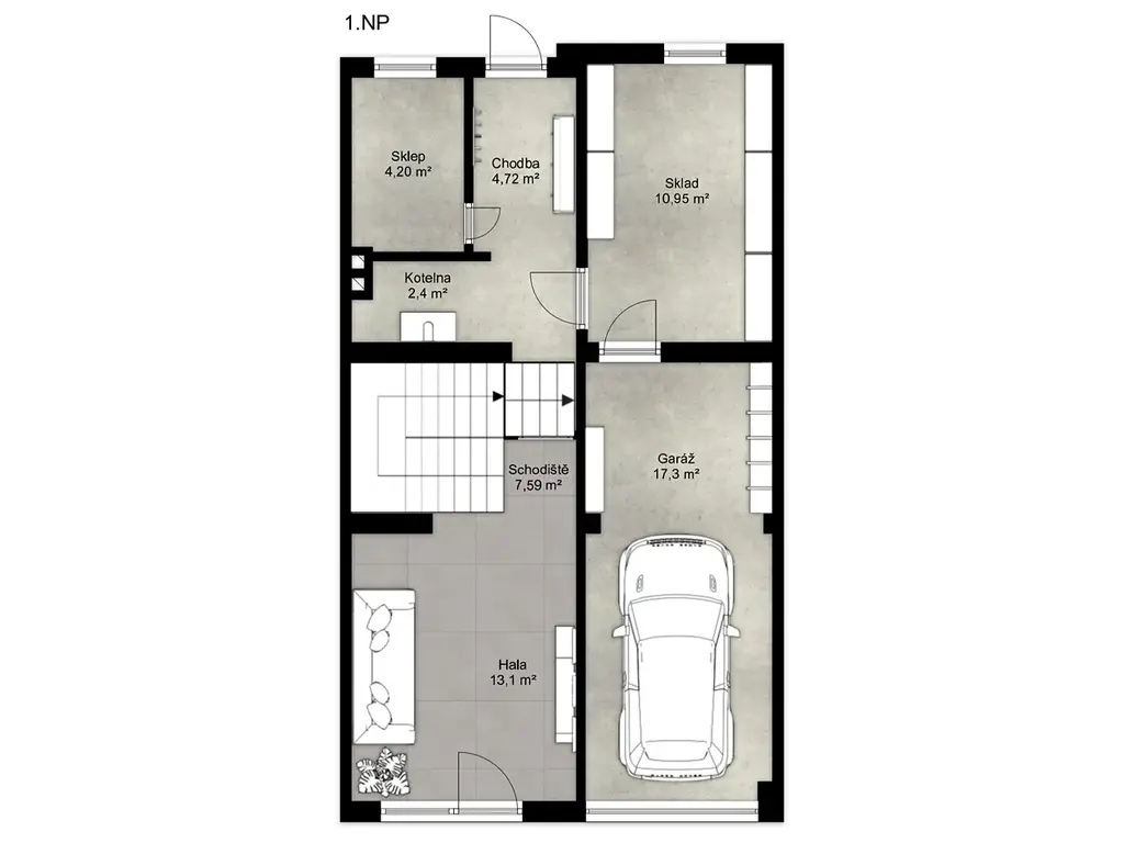 V přízemí se nachází vstupní hala 13,1 m², schodiště 7,59 m², chodba 4,72 m², garáž 17,3 m², kotelna 2,4 m², sklep 4,2 m², sklad 10,95 m² a vstup na zahradu o velikosti 75 m². Přízemí lze po úpravách využít také jako další obytné místnosti.