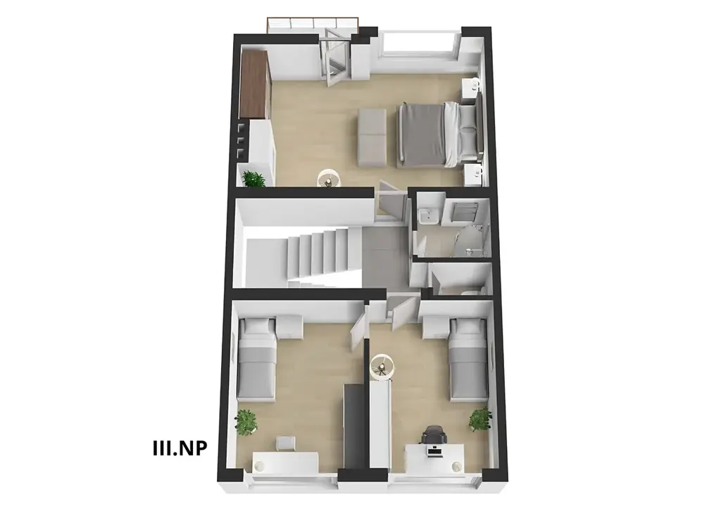 Druhé patro tvoří dva pokoje o velikosti 11,3 m² a 12,1 m² a ložnice 24,15 m² se vstupem na balkon 2,7 m², dále koupelna 1,75 m², samostatné WC 1,12 m² a schodiště 7,59 m². Dům navíc nabízí půdní prostor o velikosti přibližně 55 m², který je vhodný k případné vestavbě a dalšímu rozšíření obytné plochy.