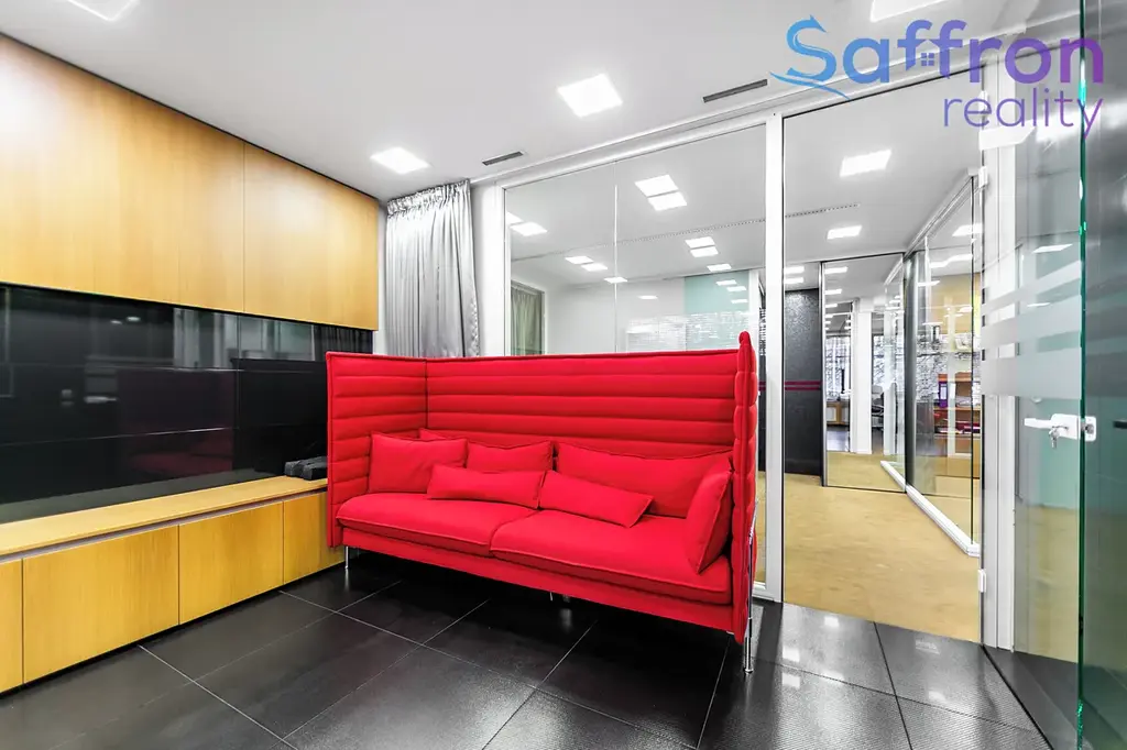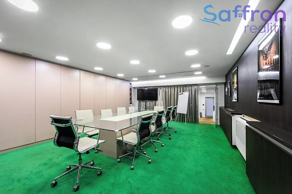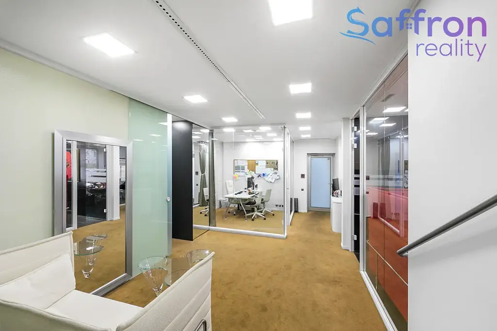 Jedná se o nebytovou jednotku o celkové podlahové ploše 155 m², která je dispozičně řešena jako kombinace samostatných kanceláří, otevřených pracovních prostor a reprezentativního zázemí. Součástí je vstupní recepce, prostorná zasedací místnost, kuchyňka a sociální zázemí včetně sprchy. Prosklené příčky dodávají interiéru vzdušnost a zároveň umožňují flexibilní uspořádání jednotlivých částí dle potřeb nového majitele.