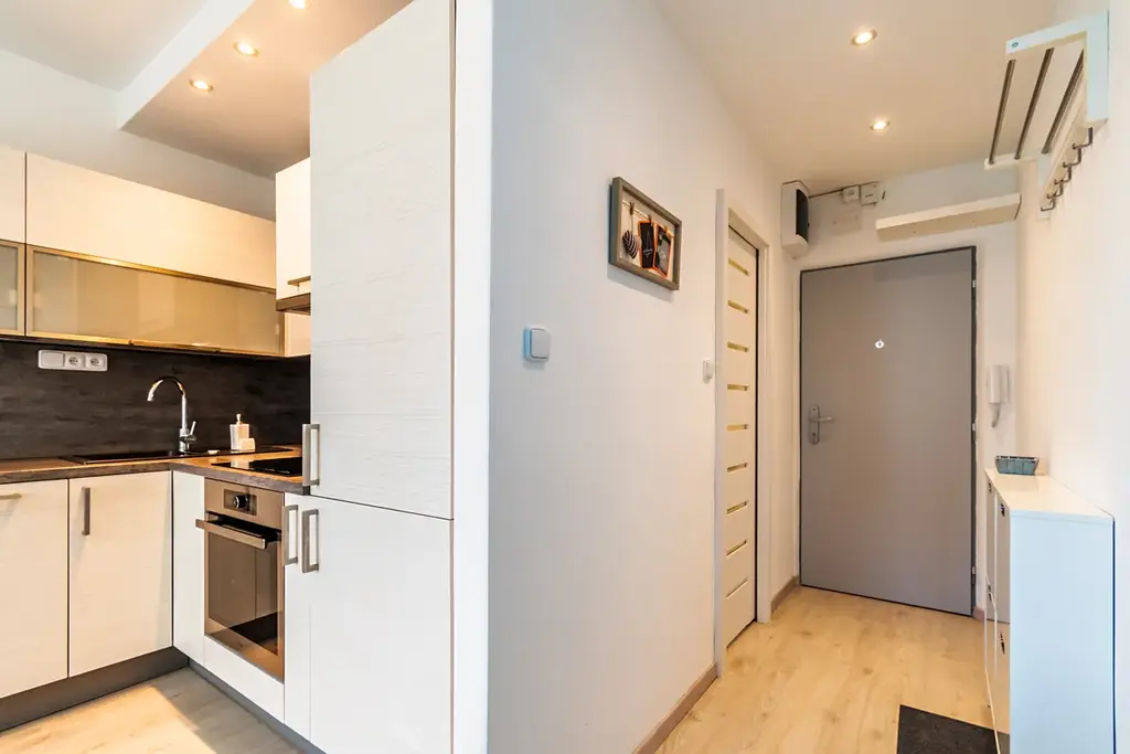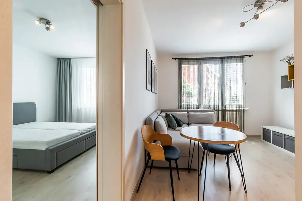 Dispozice bytu tvoří obývací pokoj vybaven pohodlnou sedačkou, jídelním setem a plně vybaveným kuchyňským koutem, samostatná ložnice s manželskou postelí a velkou vestavěnou skříní, koupelna se sprchovým koutem, WC, umyvadlem a pračkou. Nechybí také praktická lodžie umístěná na mezi patře nebo sklepní kóje.Byt je ideální pro jednotlivce nebo pár, kteří hledají stylové a klidné bydlení s dobrou dostupností do centra. K dispozici od 1.7.2026.