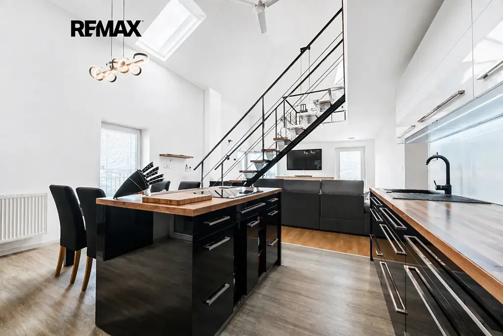 Dominantou hlavního podlaží je prostorný a světlý obývací pokoj propojený s kuchyňským koutem a jídelní částí. Tento otevřený prostor tvoří přirozené centrum celého bytu – ideální místo pro rodinný život, společné vaření, posezení s přáteli i klidné večery.