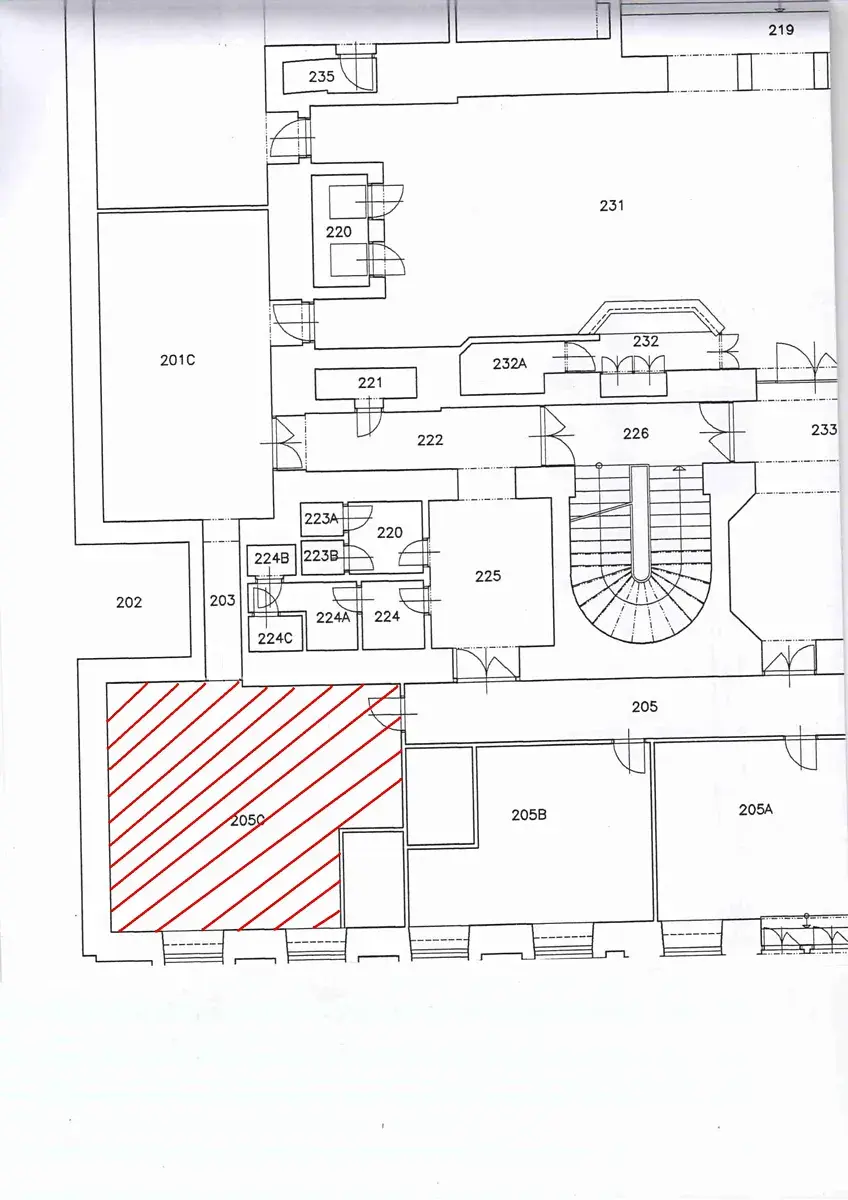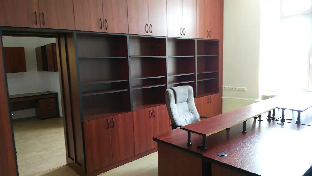 Prostor tvoří jedna velká kancelář se dvěma okny, která je rozdělena nábytkovou stěnou na 2 menší části. Kancelář je vymalovaná na bílo, na podlaze je položeno lino. V kanceláři je malá kuchyňská linka.