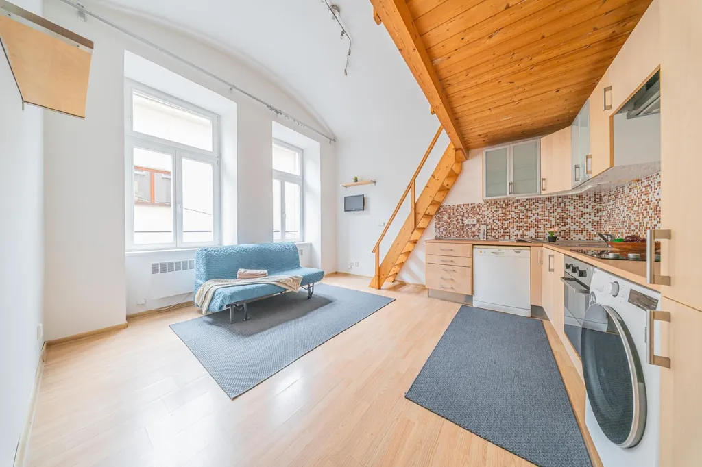 Praktická dispozice 2+kk využívá efektivně každý metr čtvereční, který zde máte k dispozici. Z předsíně je vstup do koupelny se sprchovým koutem a WC, do ložnice a také do hlavní obytné místnosti, obývacího pokoje s kuchyňským koutem. Vysoké stropy zajišťují jak příjemnou vzdušnou atmosféru, tak přináší i dostatek místa. Tento potenciál je plně využit nad kuchyňským koutem, kde najdete praktické dřevěné patro. Můžete jej využít jako další místo ke spaní či jako nadstandardní úložný prostor.