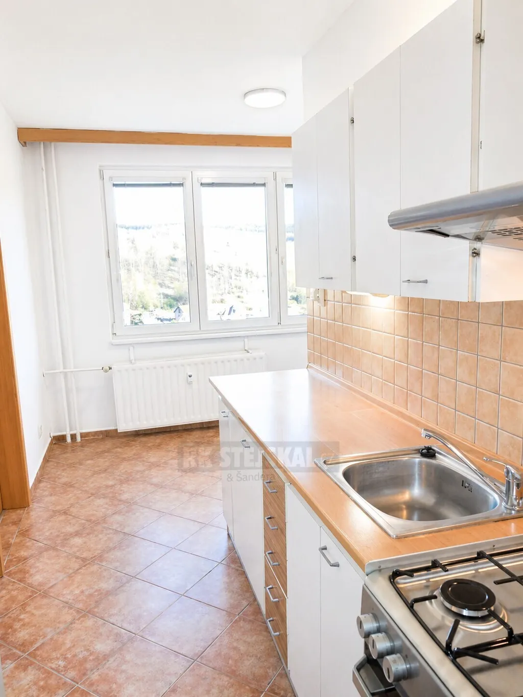 Dispozice: zádveří, chodba s vestavěnými šatními skříněmi, zděné bytové jádro, samostatná koupelna se sprchovým koutem, umyvadlem a prostorem pro pračku, samostatné WC, velice prostorná, hlavní obytná místnost, samostatná kuchyň s linkou a s jídelním prostorem, všechna okna bytu s otevřeným výhledem, k bytu náleží sklepní kóje a možnost užívání všech společných prostor v domě.