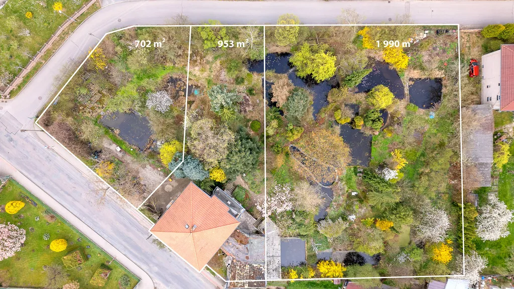 Součástí nabídky jsou tři pozemky, které jsou již samostatně evidovány v katastru nemovitostí s možností rozdělení na celkem 4 pozemky. Tato kombinace nabízí zajímavý potenciál jak pro rozšíření velkorysého rodinného bydlení, tak pro investiční možnosti výstavby nového projektu na nadstandardním pozemku. Na pozemku se nachází několik okrasných rybníčků a jezírek. Pozemek nabízí přístup ze dvou ulic, z obou stran pozemku se nacházejí také inženýrské sítě, což poskytuje větší flexibilitu využití.