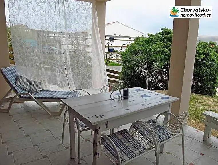 Před apartmánem se nachází velká krytá terasa s výhledem na moře a upravenou zahradu.