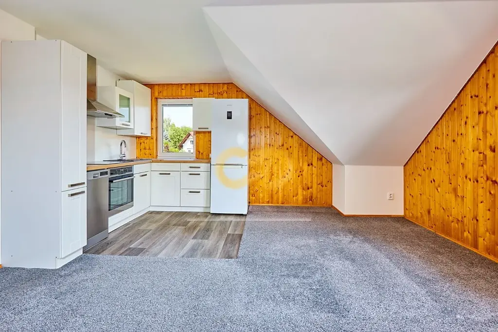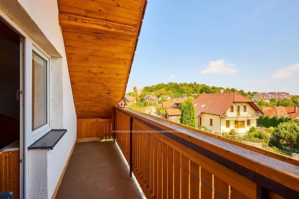 V podkroví rodinného domu na vás čeká prostorný byt 2+kk o 70 m² s lodžií 6 m², odkud si vychutnáte ranní kávu i večerní západy slunce.
