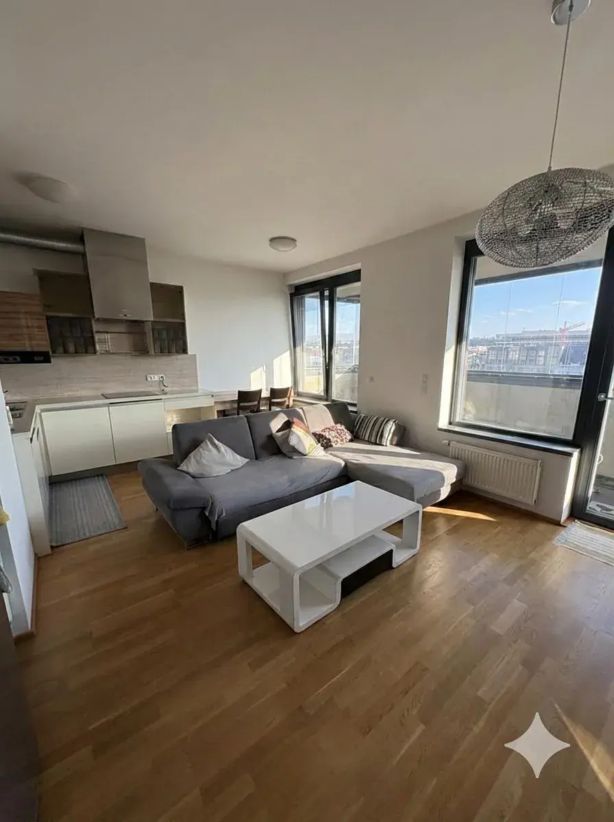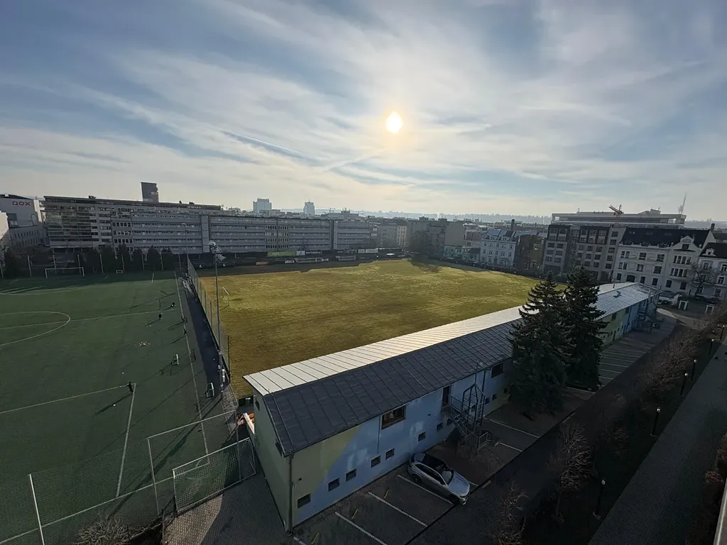 Byt se nachází v sedmém patře s výhledem, který dodává prostoru otevřený a světlý charakter.