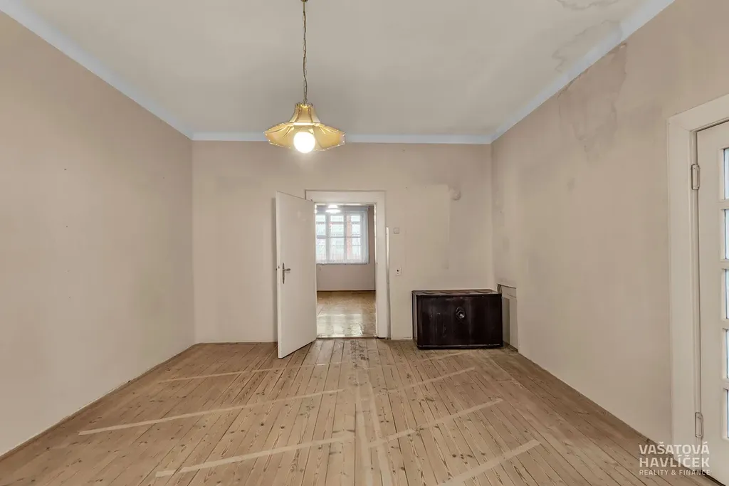 Přední dvoupodlažní dům z roku 1932 nabízí 149 m² podlahové plochy. Stavba je ze smíšeného zdiva (opuka, kámen) a střechu kryje eternit. Do ulice směřují plastová okna s dvojsklem, do zahrady pak původní špaletová. Interiér tvoří trámové stropy a dřevěné podlahy v obou podlažích, v kuchyni je linoleum a na chodbách i koupelně dlažba. Dům je delší dobu neobývaný, přesto je v dobrém technickém stavu.
