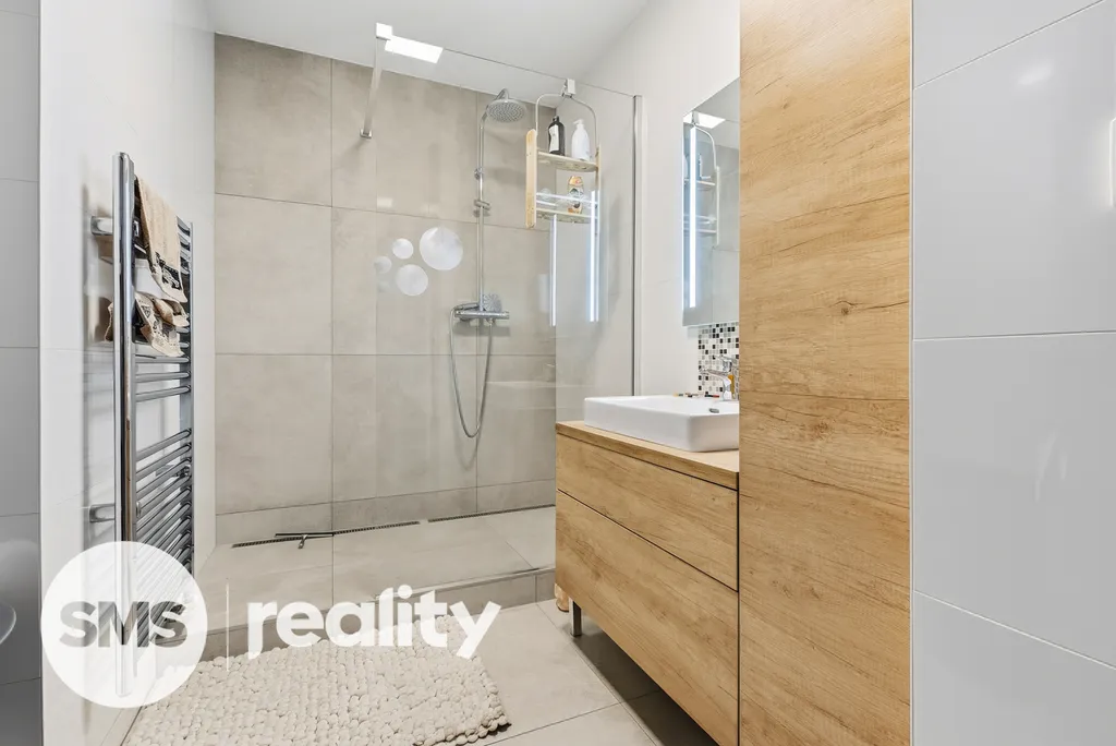 Byt je vybaven kuchyňskou linkou s indukční varnou deskou, má plovoucí podlahy, samostatnou toaletu a sprchový kout.
