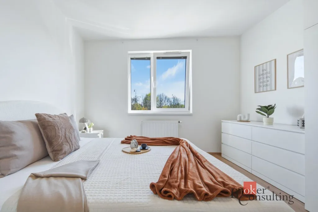 Ložnice je řešena v klidném duchu s dostatkem prostoru pro odpočinek i úložné řešení. Celkový dojem bytu podtrhuje čistý design, kvalitní podlahy a sladěné detaily, které vytvářejí harmonický celek vhodný jak pro vlastní bydlení, tak i jako investice k pronájmu.