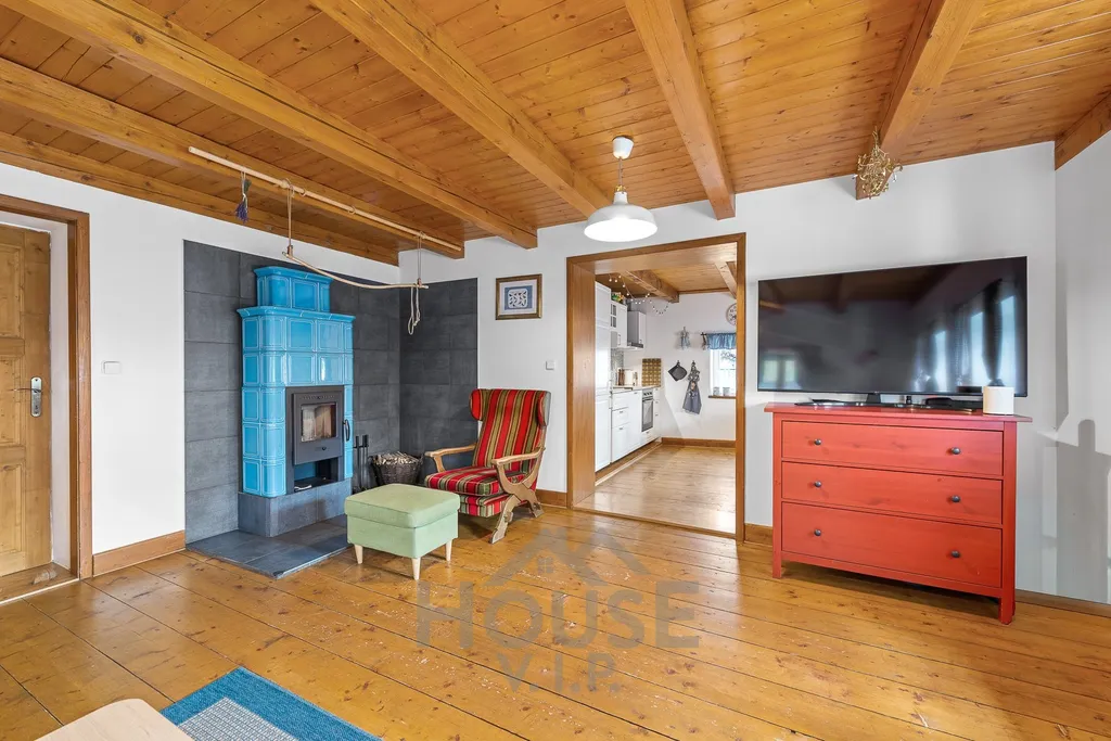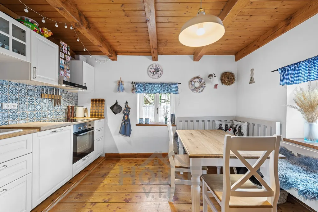 Ve druhém podlaží jsou dvě prostorné ložnice a velká hala, kterou lze využít jako odpočinkovou zónu nebo pracovnu. Interiér působí velmi útulně a vkusně — dřevěné podlahy, obklady a přiznané trámy vytvářejí hřejivou atmosféru, zatímco moderní vybavení zajišťuje pohodlí pro každodenní užívání.