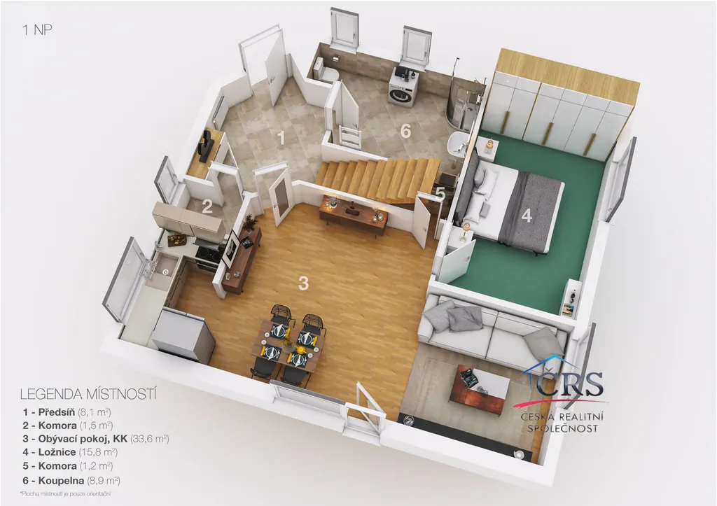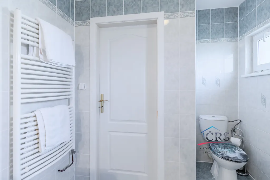 Na podlahách naleznete kombinaci plovoucí podlahy, dlažby a koberců, což přispívá k pohodlí i praktickému využití jednotlivých místností.