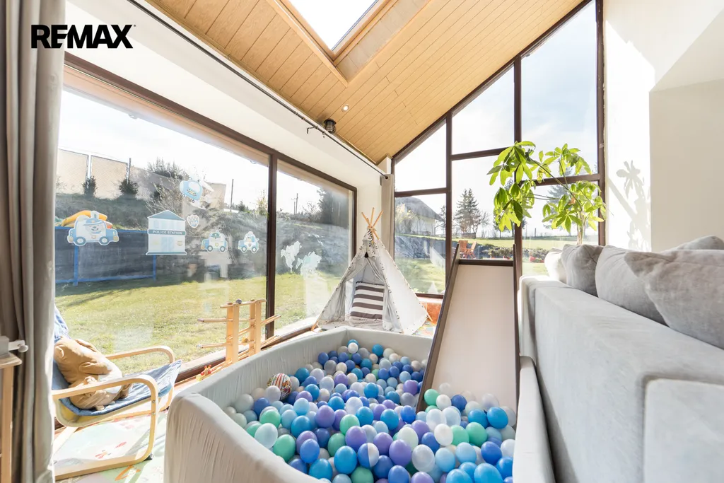 Dům nabízí podlahovou plochu přes 200 m². Dispozice je řešena velmi prakticky – v přízemí se nachází prostorný obývací pokoj s kuchyňským koutem a místem na hraní pro děti a posezením u krbu, koupelna, pracovna, technická místnost a velká vstupní hala. V podkroví pak najdete tři samostatné pokoje (jeden dětský pokoj a dvě ložnice) a druhou koupelnu (se sprchovým koutem i vanou), což zajišťuje dostatek soukromí pro celou rodinu. Druhá polovina podkroví může být využita pro dokončení dalších případných obytných prostor.