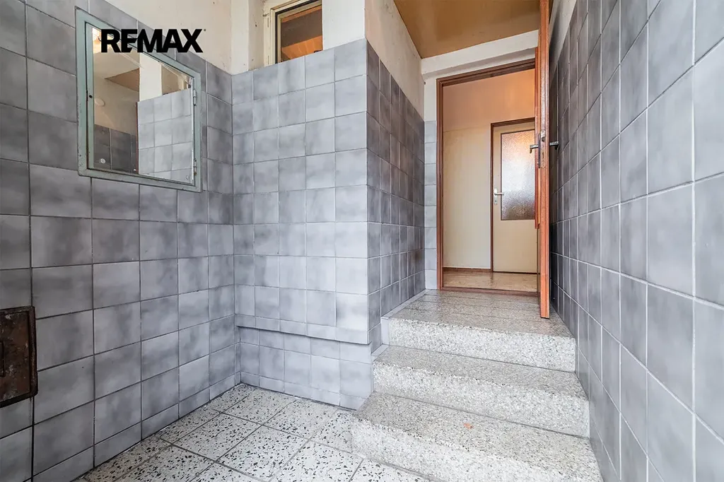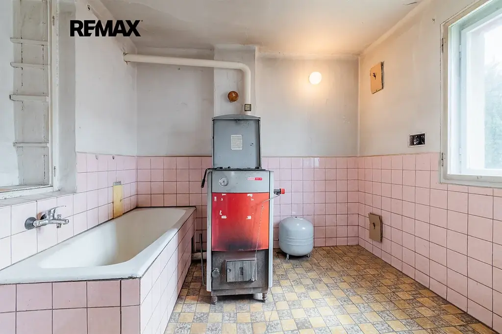 Obě části domu jsou tedy nyní propojeny společnou koupelnou, nicméně dispozice umožňuje poměrně snadné vybudování druhé koupelny v původní části domu, kde se nyní nachází kotel na uhlí, který zajišťuje vytápění celého domu. K instalaci je případně připravený nový kotel.