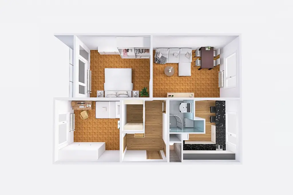 Byt se skládá z chodby, samostatného WC, koupelny se sprchovým koutem, komory, kuchyně, obývacího pokoje, ložnice s lodžií a jednoho neprůchozího pokoje. Orientace bytu je na jihozápadní a severovýchodní stranu, byt je tak dobře prosvětlený. Na podlahách jsou parkety a PVC. V koupelně ker. dlažba. Kuchyňská linka obsahuje vest. spotřebiče (myčka, plynová varná deska, hork. trouba). K dispozici je také lednice a mikrovlnná trouba. Všechna okna jsou plastová. Vytápění a ohřev vody jsou ústřední dálkové. Parkování je dostupné na parkovišti před domem.