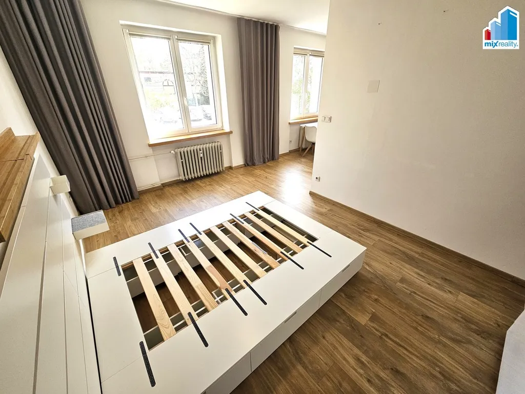 Byt je dále vybaven postelí a vestavěnými skříněmi, pohovka bude dodána.
