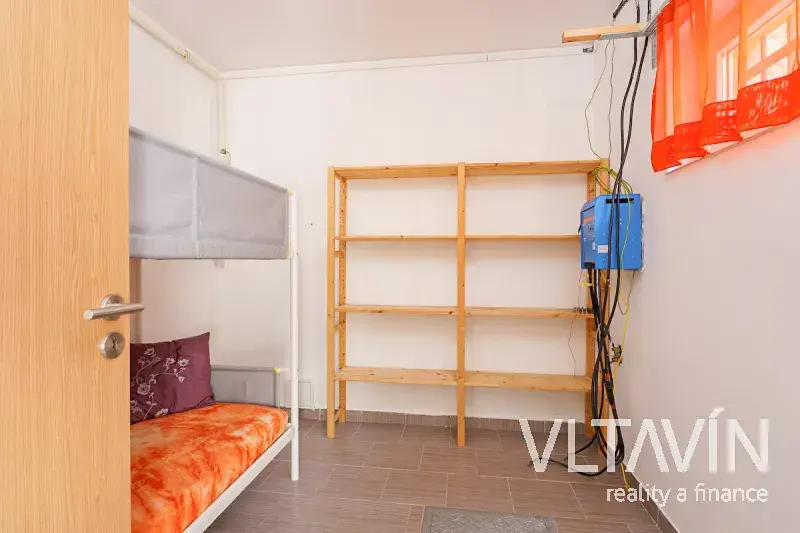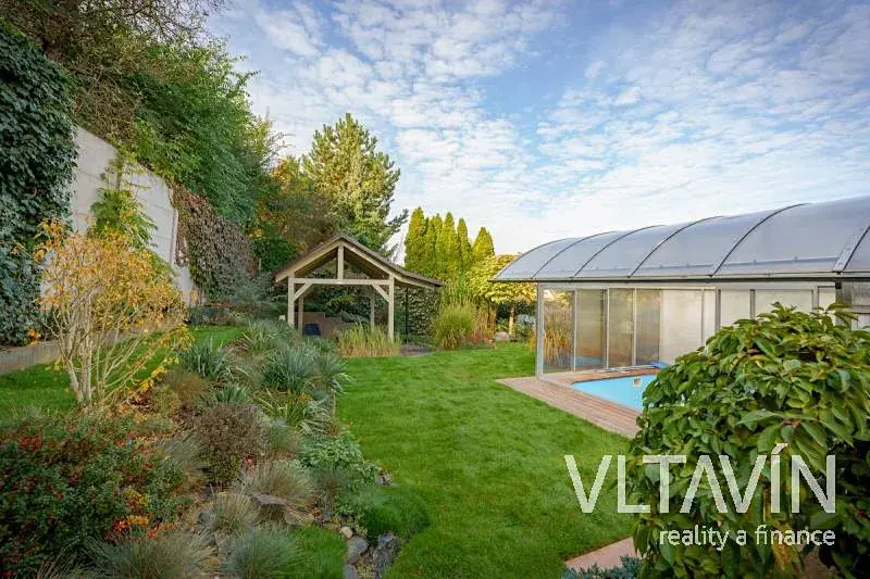 V 1. PP se nachází sklepní skladová místnost, technická místnost a 2 pokoje. Díky velkým francouzským dveřím je interiér těchto pokojů plynule propojen s terasou a pečlivě udržovanou zahradou s bazénem - ideálním místem pro odpočinek i rodinná setkání. Na zahradě s nachází ještě jedno zastřešené sezení.