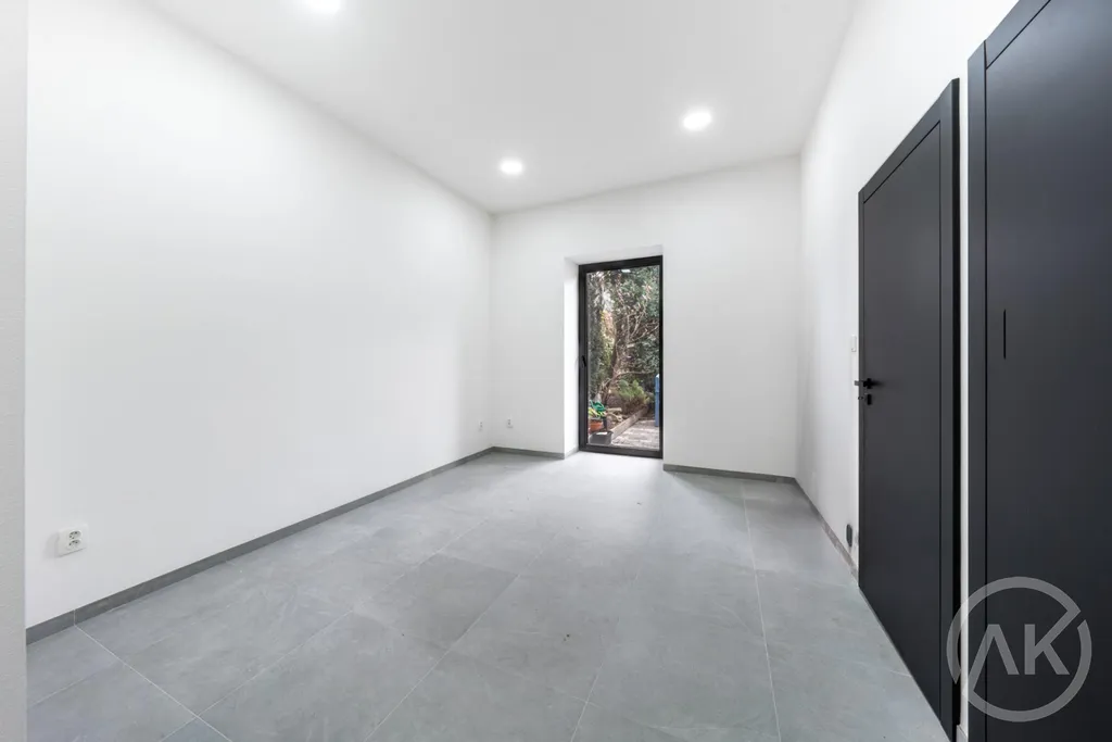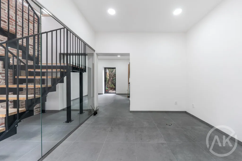 - za prosklenou stěnou je zajímavý prvek schodiště do vrchního patra, kde je byt. Ten je určen na nadstandardní, krátkodobý business pronájem. Každý den nová příležitost. Samo se to dá snadno vyřešit tak, abys vidět nebyl/a pokud nechceš,