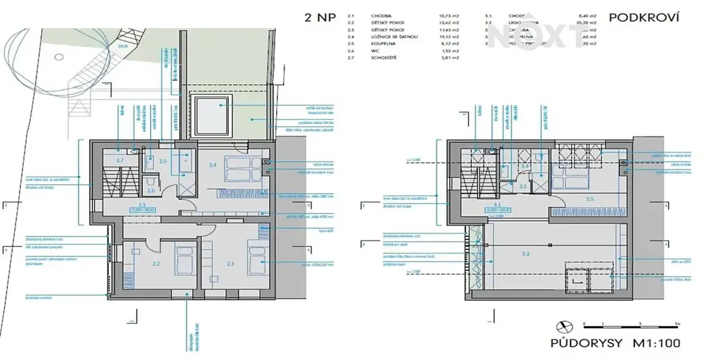 Druhé patro nabízí ložnici rodičů, dětské pokoje a koupelnu.