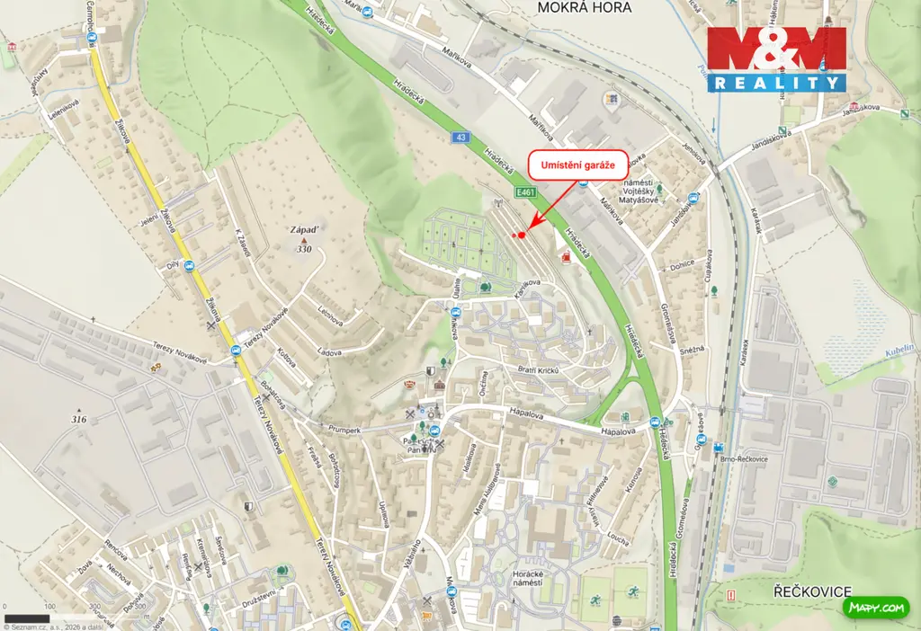 Nabízíme k pronájmu řadovou garáž v klidné části Řečkovic. Panelová konstrukce, užitná plocha 18 m², garáž v dobrém stavu. Vhodná pro parkování osobního vozu nebo jako skladovací prostor. Klidné okolí a snadný přístup. Velkou výhodou je zavedená elektřina 220 V se 2 zásuvkami a osvětlením. Spotřeba je měřena vlastním elektroměrem, což zajišťuje přesné vyúčtování. Lokalita je klidná, dobře přístupná a přehledná, což umožňuje snadnou manipulaci při vjezdu. Ideální volba pro ty, kteří hledají spolehlivé zázemí pro svůj vůz či majetek v této lokalitě.
