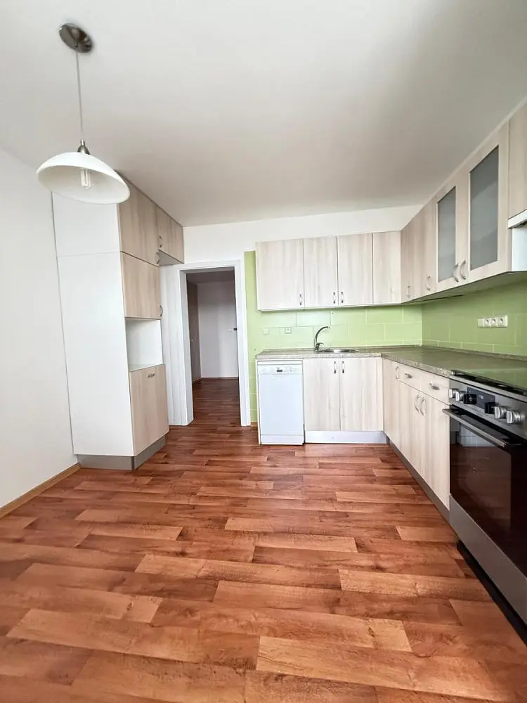 Kuchyně je samostatná, opravdu prostorná a díky rohové kuchyňské lince nabízí spoustu pracovního i úložného místa včetně praktické odkládací stěny na potraviny. K dispozici je myčka nádobí, digestoř i kombinovaný sporák. Z kuchyně se vstupuje na zasklenou lodžii ideální místo na ranní kávu nebo večerní relax s famózním výhledem.