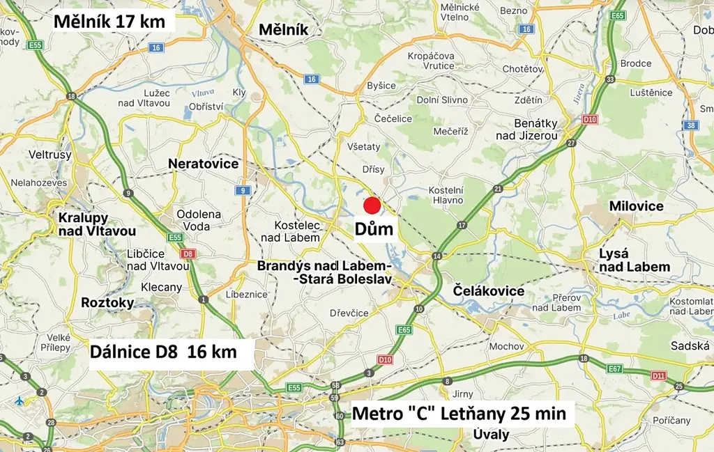 Prodej rodinného dům o celkové ploše 321 m2 v obci Ovčáry u Mělníka, situovaný v klidné části Polabské nížiny s výbornou dopravní dostupností. Mělník je vzdálen 17 km, nájezd na dálnici D8 cca 16 km a stanice metra C Letňany je dostupná přibližně za 25 minut jízdy.