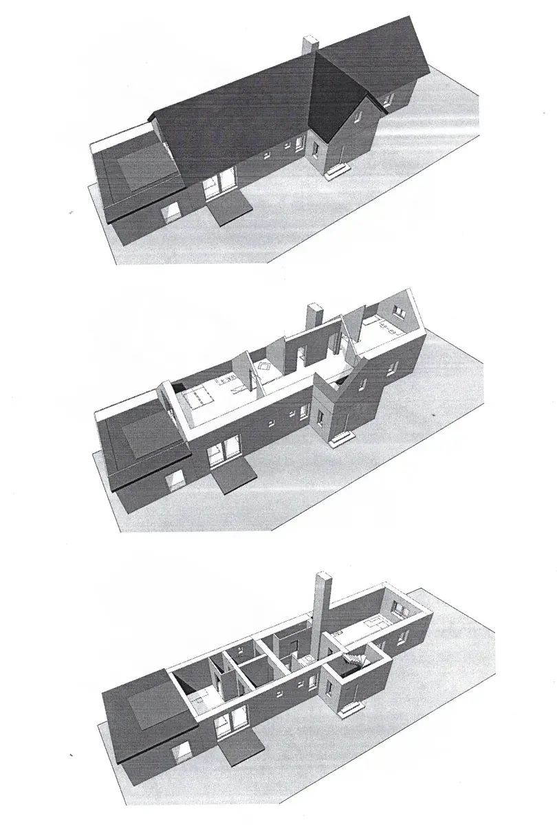 Dispozice domu: zádveří (s plánovaným schodištěm do podkroví), chodba, obývací pokoj s kuchyní a jídelnou, ložnice, malý pokoj, koupelna a samostatné WC.