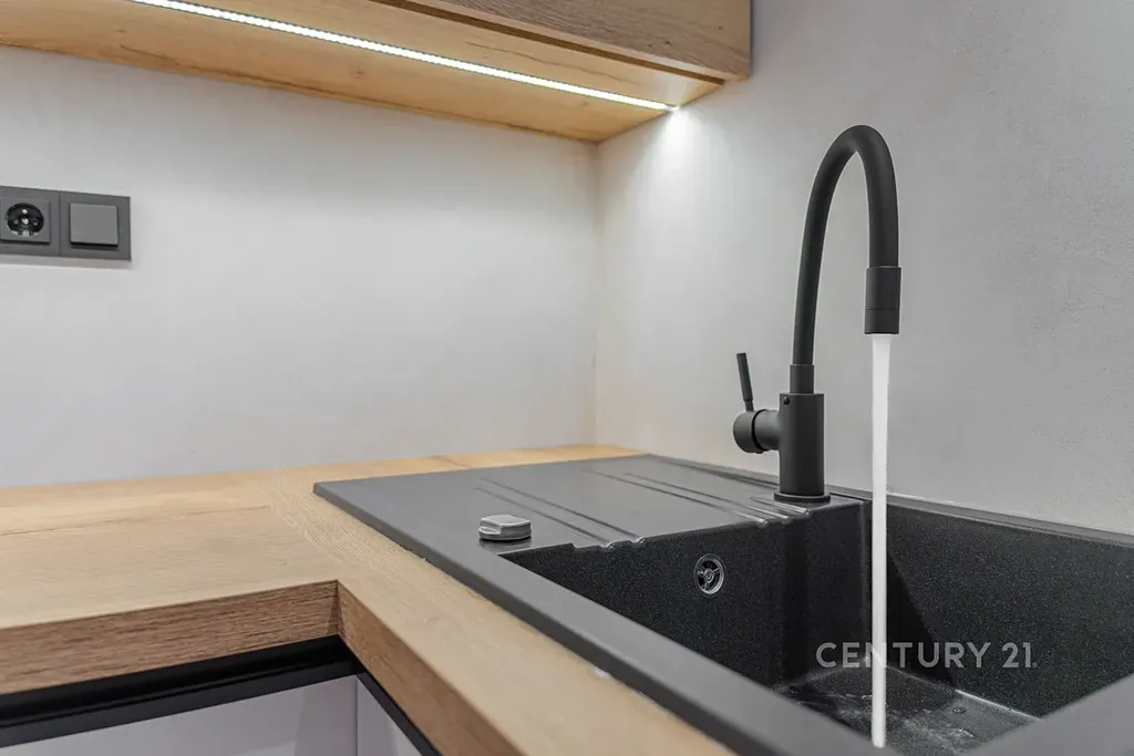 Dominantou bytu je kuchyňská linka na míru s moderními prvky, LED podsvícením a nočním osvětlením na čidlo, doplněná o kvalitní spotřebiče značky Gorenje.