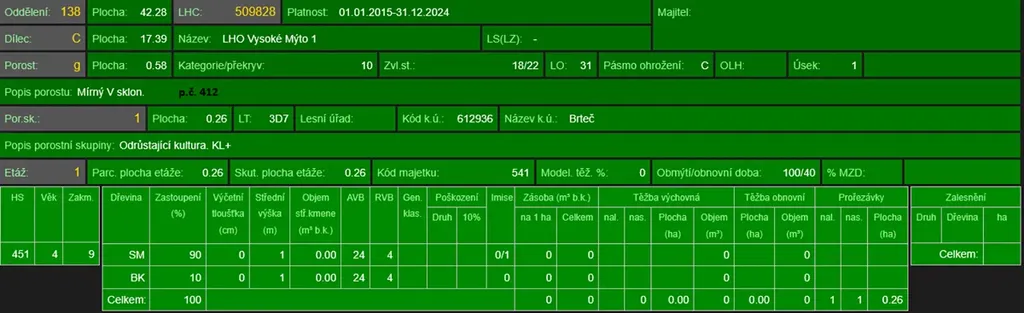 - p.č. 412 vedená jako lesní pozemek o celkové výměře 5 791 m2 (stáří lesa 15 let - zastoupení dřevin smrk, buk).