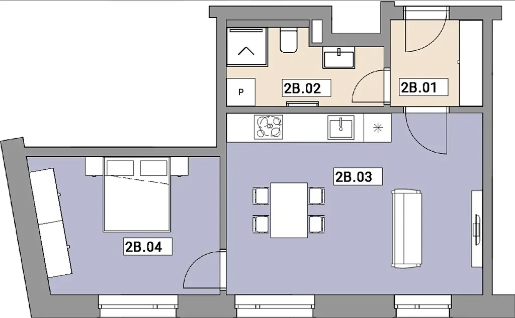 Byt 2B je dispozičně členěn na 2+kk má užitnou plochu (44 m²) a je orientován na jih, což přináší dostatek přirozeného světla a slunce po celý den. Interiér díky tomu působí velmi světle a vzdušně. Součástí objektu je také zahrádka pro rezidenty. K bytu je navíc možno dokoupit parkovací stání za cenu 600.000,- Kč bez DPH, což představuje praktické a komfortní řešení parkování v této lokalitě.