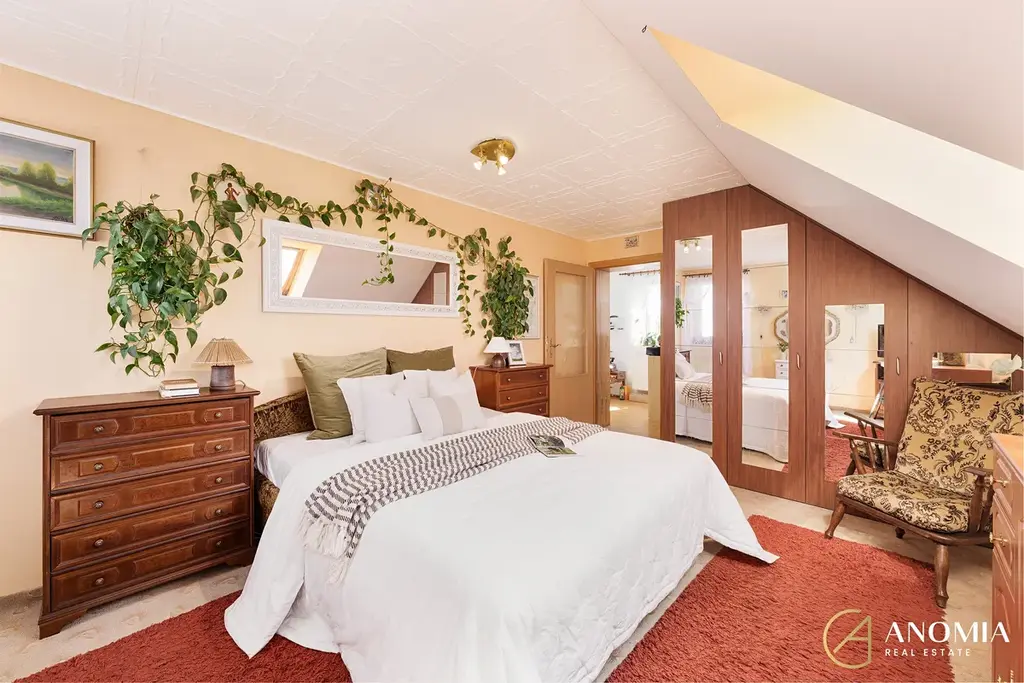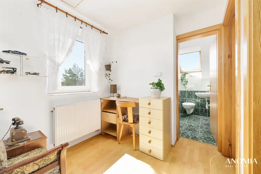 V patře se nacházejí dva samostatné pokoje, koupelna s WC a chodba se schodištěm. Pokoje mají výměry 18,11 m² a 17,60 m², takže oba nabízejí komfortní prostor například pro ložnici, dětský pokoj nebo pracovnu.