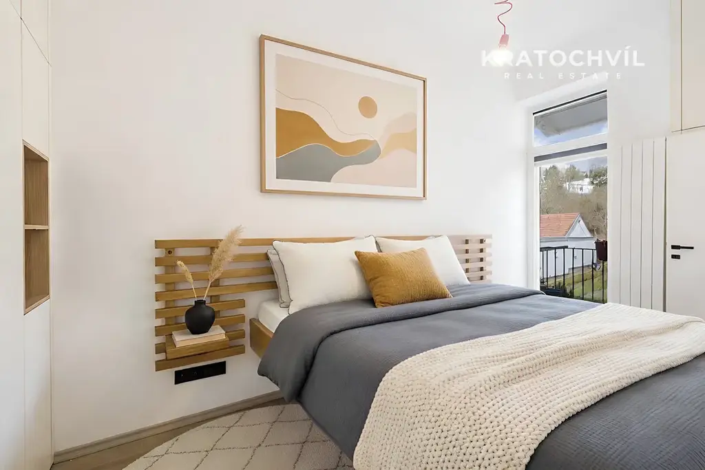 Ložnice o velikosti 12 m² nabízí klidné zázemí a zároveň přímý vstup na menší balkon s výhledem do zeleně, což vytváří velmi příjemnou atmosféru pro ranní kávu nebo večerní odpočinek.