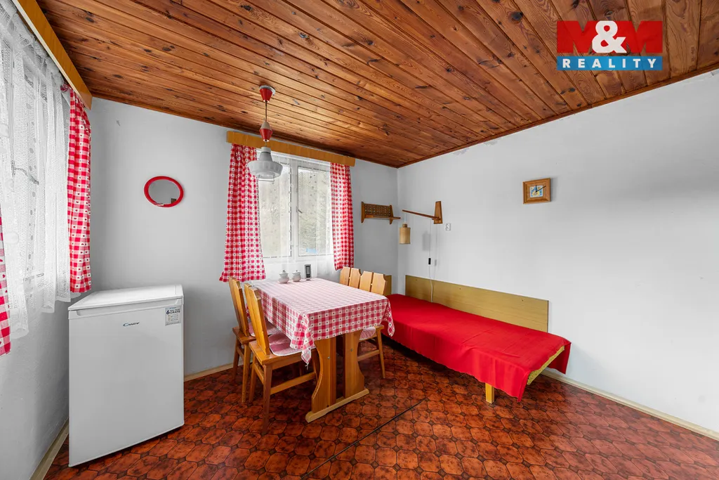 Dispozice je řešena jako jedna obytná místnost s podkrovím s celkovou užitnou plochou cca 23 m². Výhodou je sklep cca 9m², ideální pro uskladnění ovoce, zeleniny, věcí nebo zahradního vybavení. Chata je zařízená, takže ji můžete začít využívat prakticky ihned. Velkým bonusem je menší terasa, která přímo láká k ranní kávě nebo večernímu posezení. Parkování je prostorné pod chatou. Pokud toužíte po vlastním útočišti v přírodě, kde si vyčistíte hlavu a načerpáte energii, tahle chata stojí za prohlídku.