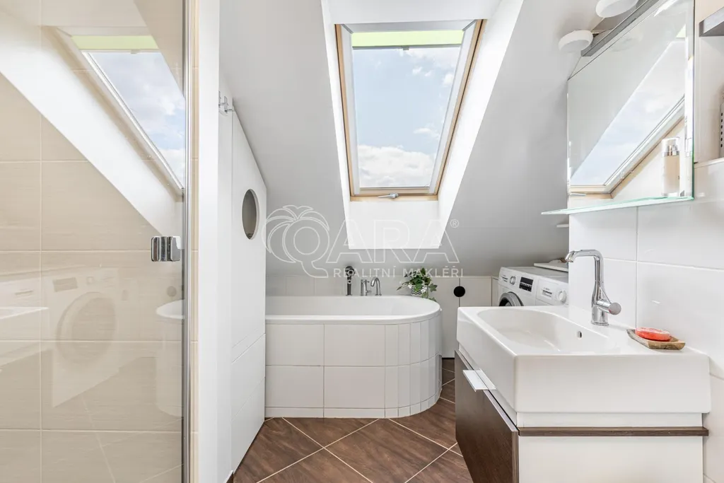 Podkrovní byty mají své kouzlo, které se těžko popisuje slovy. Tento byt vás překvapí klidem, světlem a pocitem, že jste nad městem.