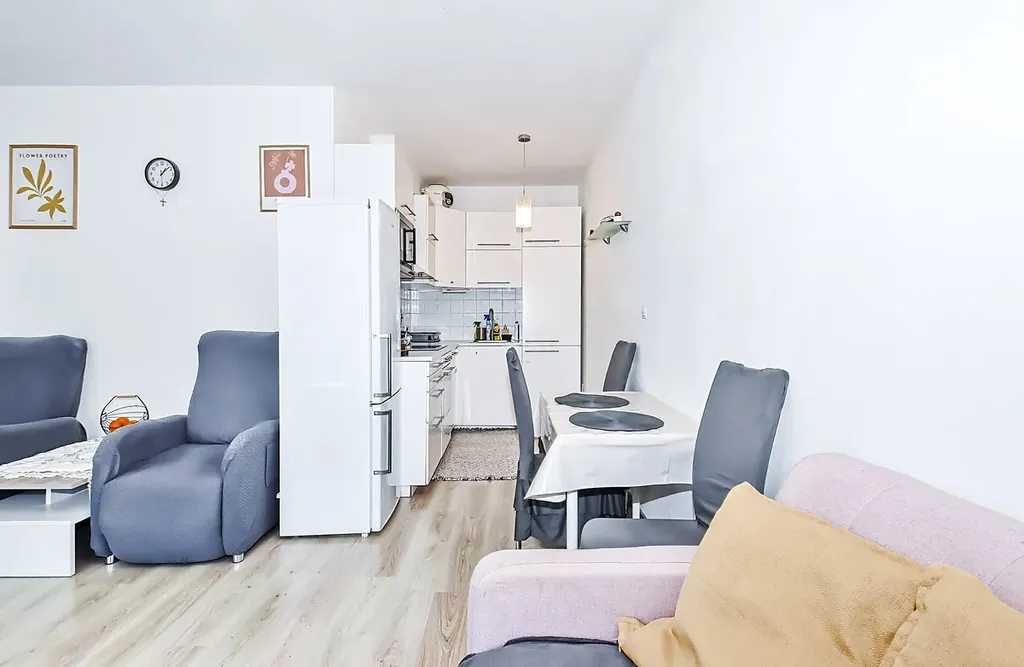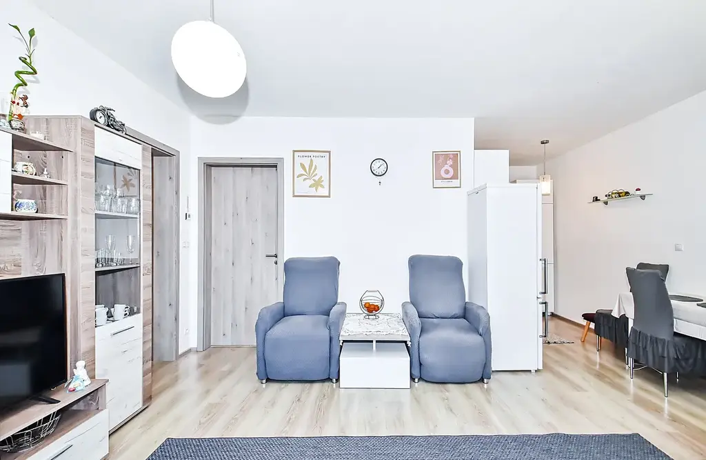 • světlý obývací pokoj s kuchyňským koutem a vstupem na balkon