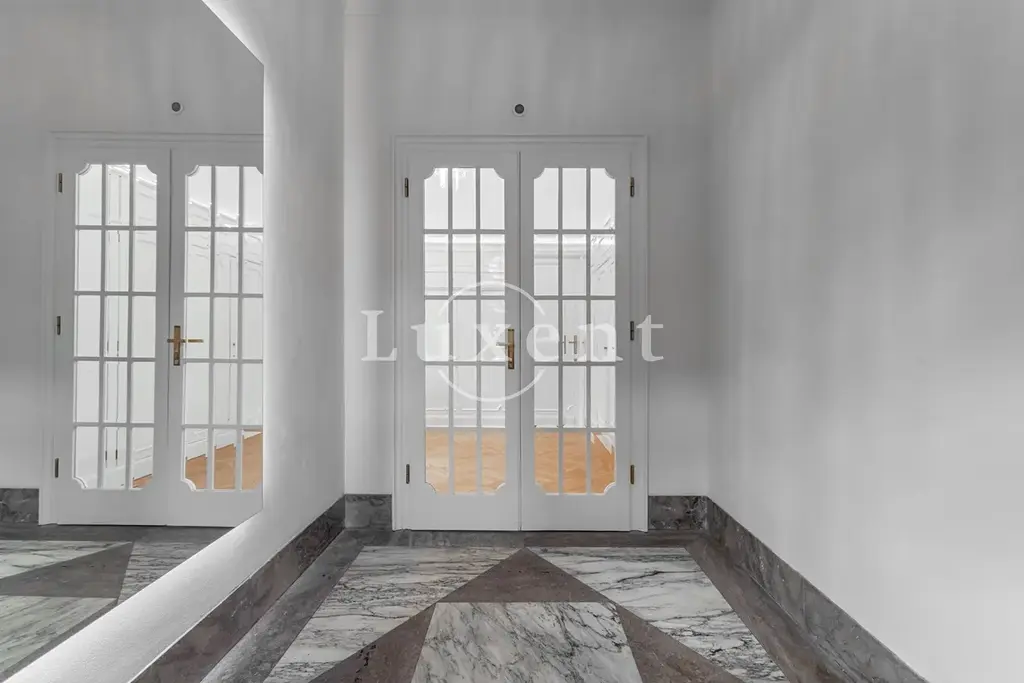 Interiér přízemí, které představuje srdce celého domu, vás přivítá velkolepou vstupní halou s původním vyřezávaným schodištěm. Další dominantou je prostorný jídelní a obývací pokoj plynule navazující na salón, kancelář a zimní zahradu. Z rozlehlé terasy, která je přístupná z haly, obývacího pokoje a kuchyně, vede dvouramenné schodiště přímo do zahrady. Na tomto podlaží dále naleznete šatnu a toaletu. Dispozice prvního patra nabízí klidovou zónu se třemi ložnicemi, dvěma luxusními koupelnami, balkonem, stylovými vestavěnými šatnami a hernou. V podkroví se nachází kuchyně, dvě koupelny, čtyři místnosti, šatny a sklady. Spolu se suterénem, který disponuje samostatným vstupem ze zahrady a prostory pro vinotéku či technické zázemí, nabízejí tato dvě podlaží prostor pro individuální dotvoření dle vašich osobních preferencí – ať už plánujte wellness, kanceláře nebo byt pro hosty či ostrahu.