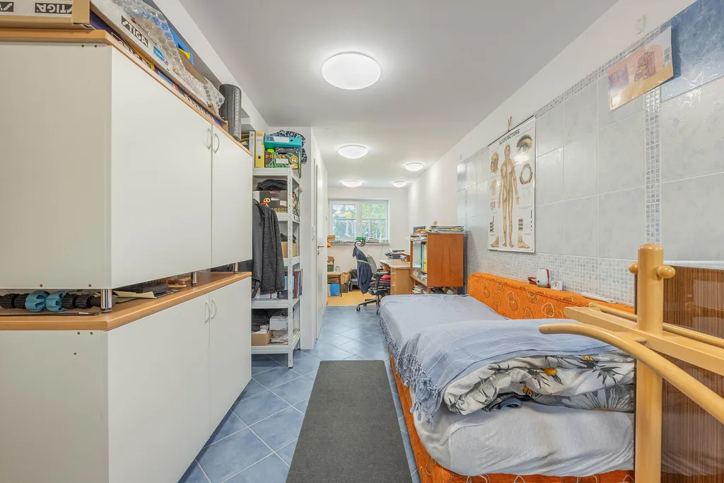 V přízemí domu najdete kromě chodby a předsíně ložnici, obývací pokoj s krbovými kamny, kuchyň, jídelnu, prostornou pergolu, koupelnu, WC a také samostatnou bytovou jednotku (se sprchovým koutem a WC) se samostatným vchodem. Tato jednotka je v současnosti využívána jako pracovna, ale může sloužit jako samostatná garsonka.