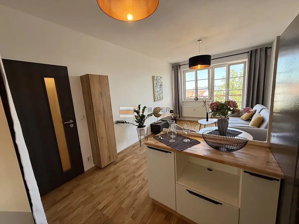 V bytě se nachází dva pokoje s dřevěnou podlahou, ložnice - vybavená novou velkou skříní, obývací pokoj vybavený novým zařízením - kvalitní sedačka, televizní stolek, konferenční stolek, stůl s židlemi, aj. Kuchyňský kout - praktická kuchyňská linka, plynová varná deska, elektrická trouba, vestavěná myčka, lednička s mrazničkou, aj. Moderní nadstandardní sociální zařízení - koupelna s proskleným sprchovým koutem (hlavová sprcha a ruční sprška), WC, koupelnový nábytek, pračka, aj. Předsíň se skříní na oblečení, věšák na oblečení a samostatný botník.