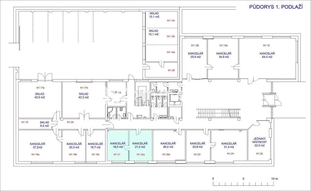 Nabízíme dvě propojené kanceláře v přízemí moderní administrativní budovy s recepcí v blízkosti sjezdu z dálnice D1 a na ulici Vídeňská. Kanceláře mají velikost 18 a 21m² a jsou propojené, mají však i samostatné vchodové dveře. Objekt má vlastní parkoviště pro nájemce i pro návštěvy a nakládací parkoviště pro přepravní služby, v blízkosti je další veřejné parkoviště zdarma a komerční centrum, které poskytuje veškeré služby, stravování, obchody apod. Nájemci mají k dispozici i vybavenou jednací místnost a služby recepce.