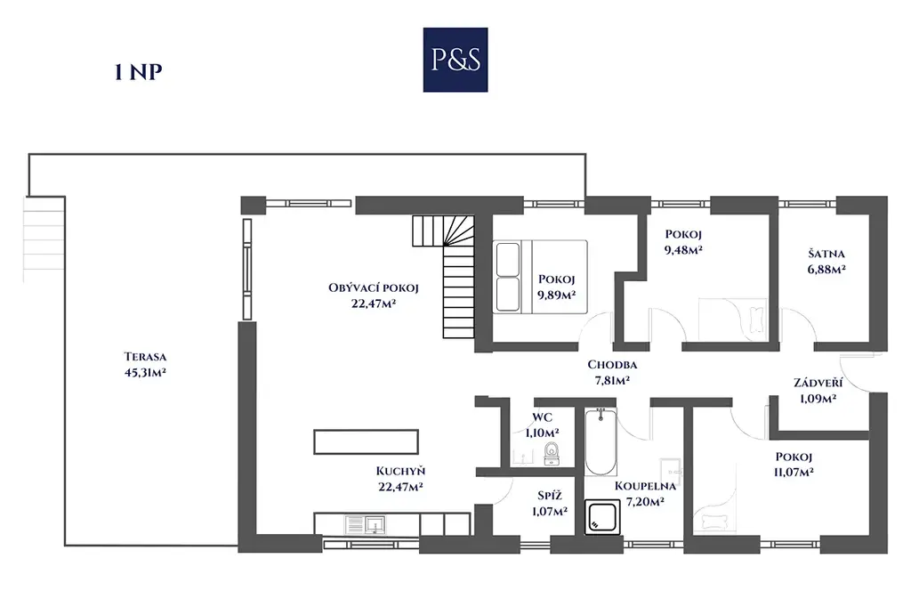 Uvnitř domu vás přivítá promyšlená dispozice 4+kk, navržená tak, aby nabídla komfort každodenního života i dostatek soukromí pro každého člena rodiny. K dispozici je šatna, špajz, koupelna se sprchovým koutem, samostatná toaleta a tři ložnice, které působí klidně, útulně a harmonicky.