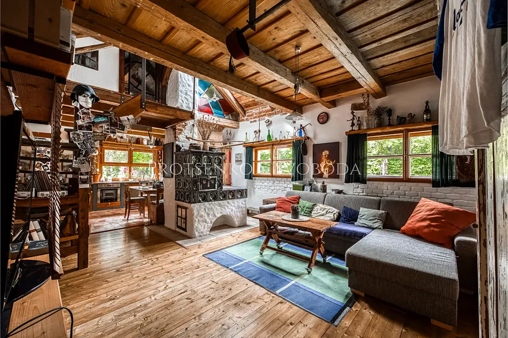 Srdcem chalupy je prostorná kuchyně propojená s obývacím pokojem, kde praskají kachlová kamna a vytvářejí hřejivou atmosféru dlouhých večerů. Odtud vede schodiště do útulné podkrovní ložnice – ideálního útočiště pro klidný spánek.